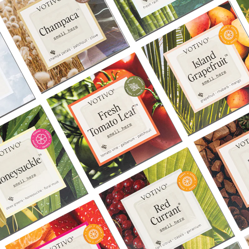 Your journey to one-of-a-kind fragrance starts here. Our New Fragrance Sample Kit features all 18 Votivo scents, each on its own card, designed for easy exploration. Peel, smell, and discover the fragrance that feels uniquely yours.